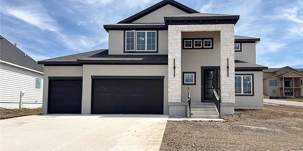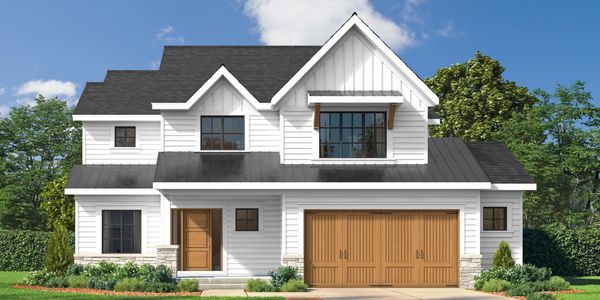 This elevation showcases a modern two-story style highlighted by clean lines, a bold entry, and transitional details that create lasting curb appeal.
