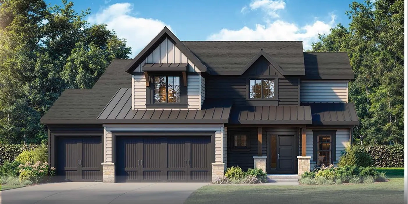 A modern farmhouse elevation highlighted by steep gables, balanced rooflines, and a welcoming covered entry.